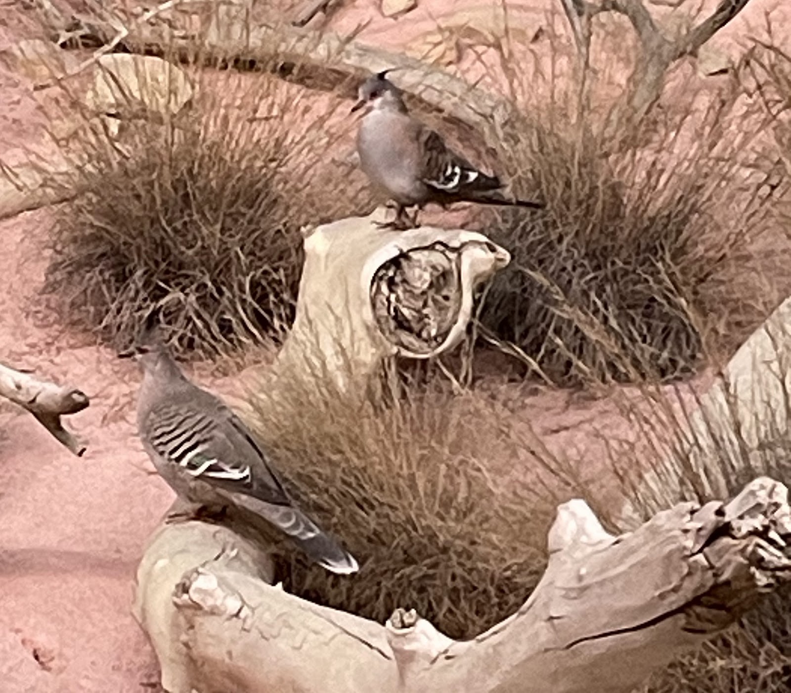 | The galah (Eolophus roseicapilla), is sometimes called the pink and grey cockatoo or rose-breasted cockatoo. It seems like the individual near the top is displaying a crest (see below). |